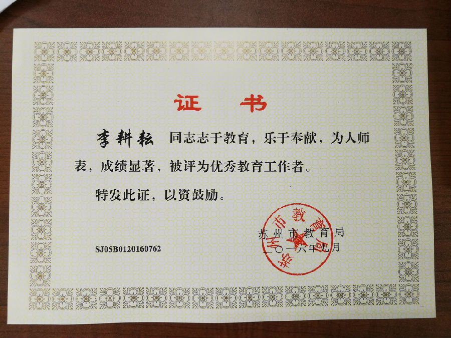 为进一步弘扬尊师重教的良好风气、建设高素质教师队伍,苏州市教育局在我国第三十二个教师节来临之际,对2015-2016年度苏州市优秀教育工作者进行了表彰。经过推荐和筛选,我院李耕耘老师获得“2015-2016年度苏州市优秀教育工作者”。