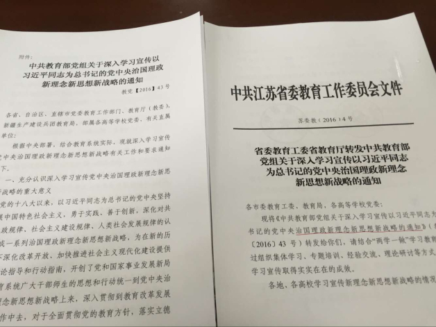 10月11日下午1点,基础部(社会科学部)组织政治、人文、体育、高等数学、计算机基础等五大教研室全体教师专题学习研讨中共江苏省委教育工作委员会文件《省委教育工委省教育厅转发中共教育部党组关于深入学习宣传以习近平同志为核心的党中央治国理政新理念新思想新战略的通知》(苏委教【2016】4号)精神。 会议由基础部(社科部)主任张正炎主持。