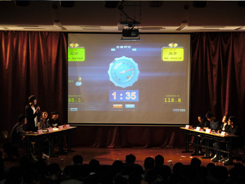 在主持人宣读完比赛规则后,辩论赛正式开始。首先是由双方的一辩陈词,进入开篇立论环节。正反双方都引用了大量的事例来论证自己的观点,赢得了阵阵掌声。在第二阶段的攻辩环节中,双方选手引经据典、慷慨激昂,言语更是争锋相对、步步紧逼,现场气氛迅速升温,达到白热化阶段。