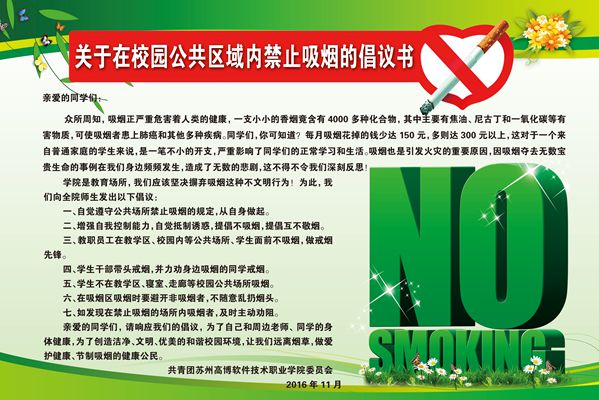 11月2日,苏州高博软件技术职业学院学生会在全院范围内开展了吸烟有害健康的宣传教育活动。团委学生会各部门的成员积极加入此项活动,走进学校食堂,走进同学们的晚自习教室,通过各种形式为大家宣传禁烟与健康的关系、监督他人禁止在公共场合吸烟、引导他人积极加入禁止抽烟的活动。