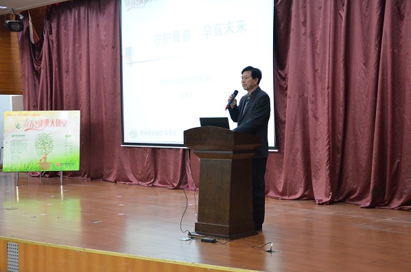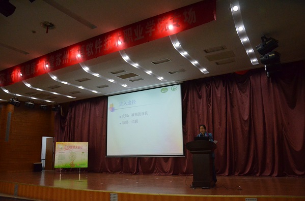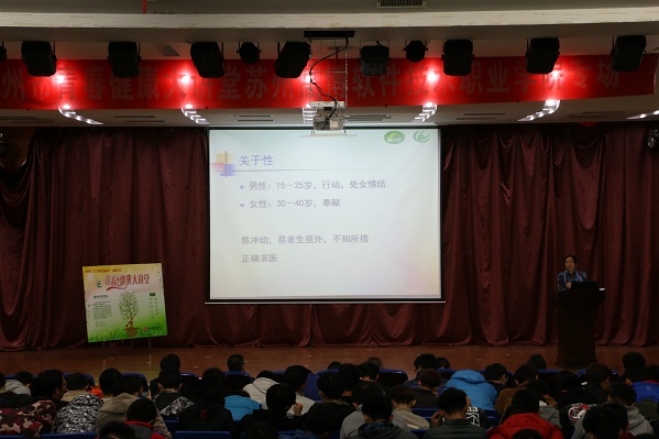 由苏州市卫计委主办的2016年“12.1世界艾滋病日”主题宣讲之青春健康大讲堂11月29日晚在我院报告厅进行宣讲,主讲人苏州市疾控中心性病艾滋病防制科赵秀萍科长。苏州市卫生和计划生育协会副秘书长袁学平、高新区卫生和计划生育局孔利琴副处长、高新区卫生和计划生育局府屹干事,我院学生处处长王绍福、副处长吴歧范,大学生心理健康指导中心王琴、陈�雯老师以及各二级学院辅导员老师出席此次讲座,全院共500多名同学参加。
