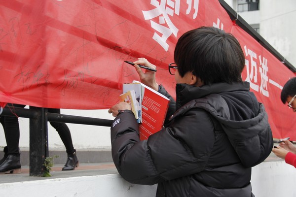 活动现场,团委提前准备了以“行动起来,向‘零’艾滋迈进――合力抗艾,共担责任,共享未来”为主题的横幅,邀请路过的师生签名支持。同时,后保处给师生们发放艾滋病宣传知识的小册子,呼吁大家行动起来,携手共同遏制艾滋。