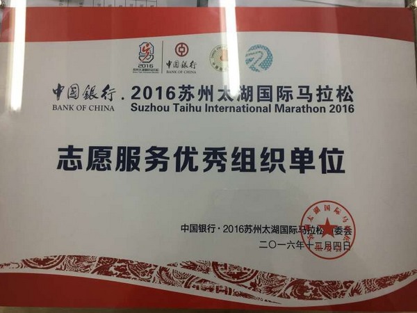 16年的12月,我院80名志愿者受高新区团委的邀请参加了苏州太湖国际马拉松志愿者服务工作,志愿者们认真负责的工作得到了主办方的认可,我院被评为“志愿服务优秀组织单位”,六名学生被评为优秀志愿者。