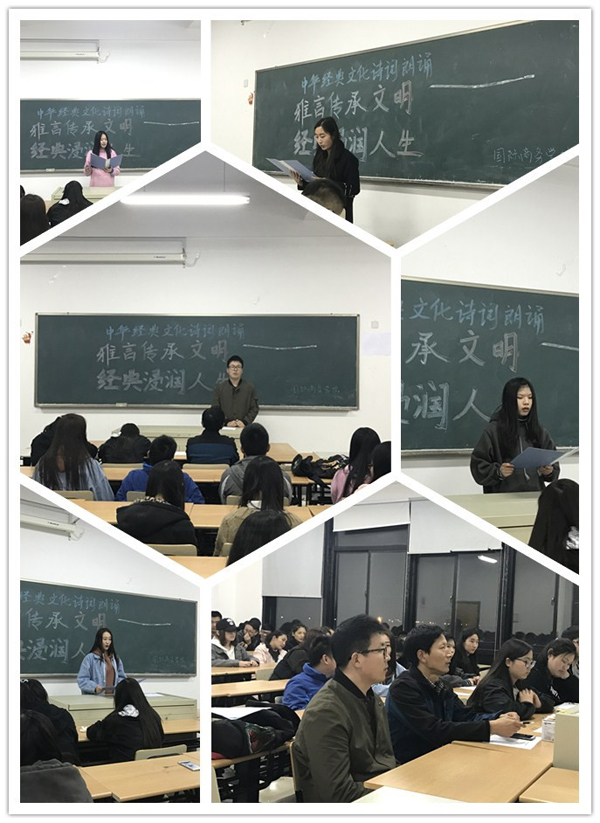 诵国学经典,传承中华文明。3月16日晚,往日安静的晚自习教室掌声雷动,气氛热烈,国际商务学院“雅言传承文明,经典浸润人生”诗词朗诵比赛正在吐火如荼的进行,经过不断筛选,共有七组选手进入到决赛环节。