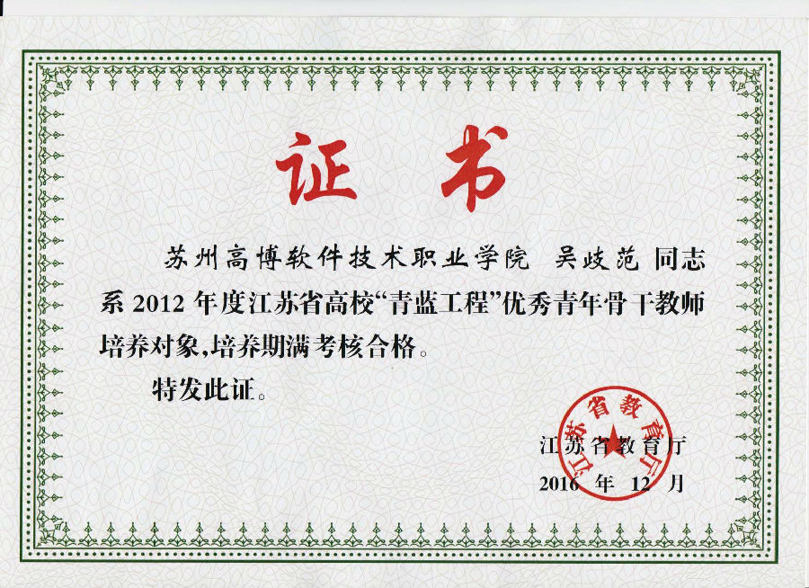 近日,省教育厅下发了2012年度高校“青蓝工程”培养对象考核证书,我院2012年度“青蓝工程”优秀青年骨干教师培养对象吴歧范同志经期满考核,获得考核合格证书。
