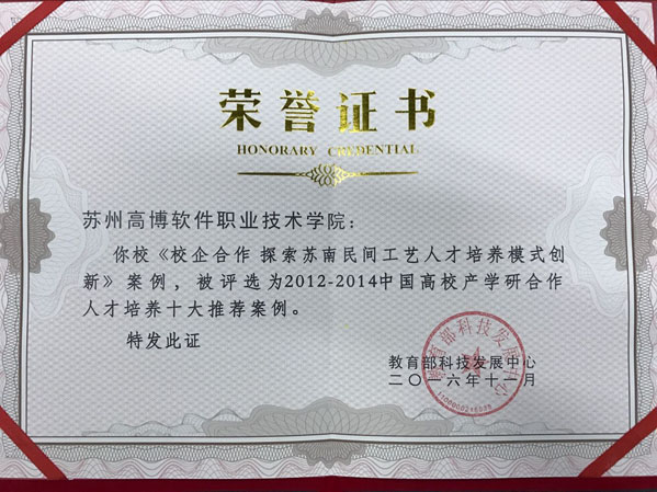 接教育部科技发展中心通知,苏州高博软件技术职业学院苏南民间工艺学院报送的《校企合作探索苏南民间工艺人才培养模式创新》人才培养案例,被评选为中国高校产学研合作人才培养十大推荐案例(2012-2014),这是学院在产学研合作科技创新工作中取得的一次重大突破。(苏南民间工艺学院 孔庆婷)