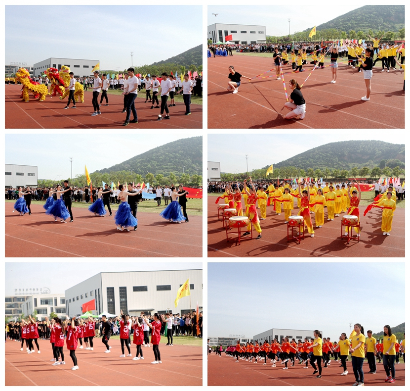 运动会开幕式第一部分是精彩的入场式,国旗、校旗、彩旗方针和各代表队方阵整齐划一,口号响亮,士气高昂,充分展现了我院大学生的精神风貌。接下来是开幕式表演,首先是由软件工程学院带来的舞狮和军体拳表演,他们身形矫健,拳脚敏捷,动作整齐,沉着有力,静如松峙山岳,动如脱兔流星,充分展现出英姿勃发的风采和铁血坚毅的阳刚之气!艺术学院的彩带舞《从这里开始》,欢乐的旋律、飘扬的彩带、多变的队形,完美呈现了他们的艺术风采。教职工用体育舞蹈表演《致青春》来体现奉献高博,以高博为家,与高博共成长的真挚情感。院团委大学生艺术团带来的鼓阵表演《中国龙》,鼓是精神的象征,舞是力量的表现,鼓舞结合开启舞蹈文化之先河。一只鼓、二十面旗帜、二十名热血男儿的旗阵表演完美诠释了信息工程学院“一鼓作气,旗鼓相当、人人点赞”的风采。国际商务学院带来的集体舞《舞动青春》,在动感的旋律、热情的舞蹈中激情绽放着他们的青春与活力。最后,充满活力和时代气息的广播体操表演,由来自5个二级学院的256名同学组成,他们以富有青春活力的旋律、整齐有序的队列,矫健有力的动作,诠释着高博学子的乐观、坚强、勇于拼搏和开拓进取精神。