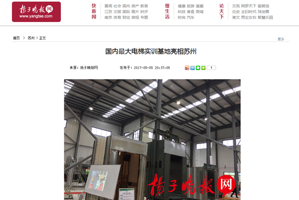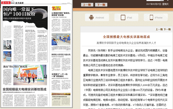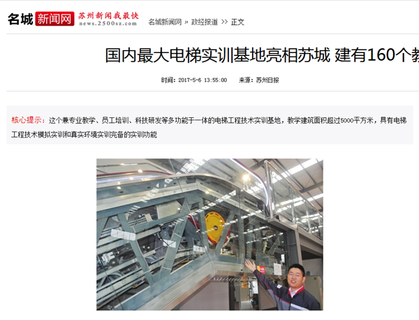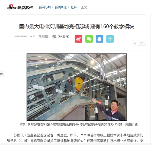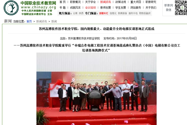 2017年5月5日上午,“中瑞合作电梯工程技术实训基地落成典礼暨迅达(中国)电梯有限公司员工培训基地揭牌仪式”隆重举行,中国职业技术教育网、新浪网、扬子晚报、苏州日报、苏州电视台等媒体争相报道。