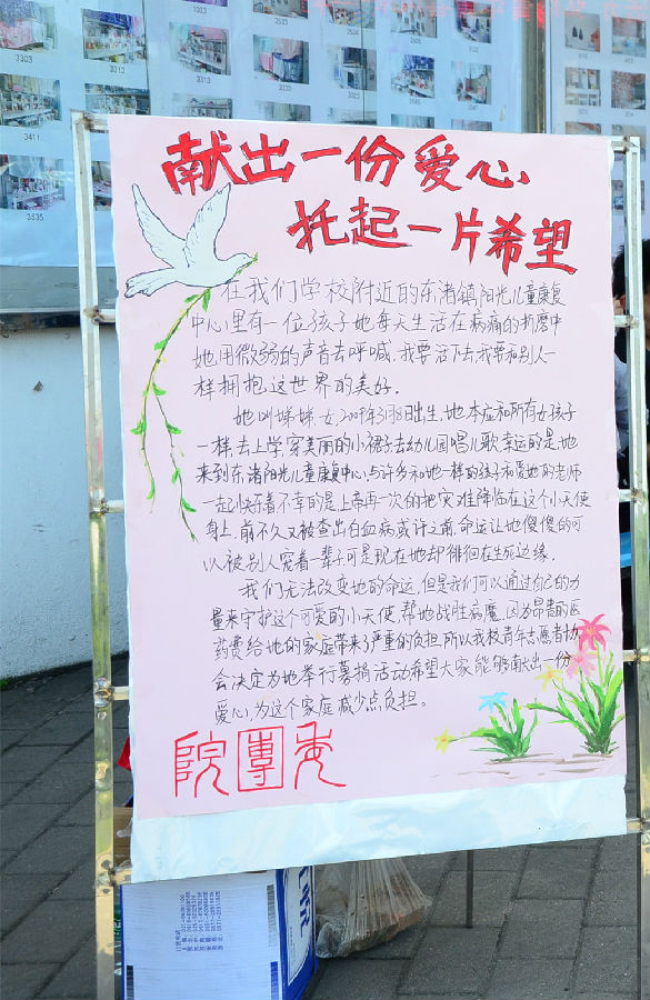 “病魔无情,人间有爱”,病魔可以夺取一个人的健康,却夺不走人间的真情。5月10-11日两天中午,大学生青年志愿者协会在工商银行门口开展了为东渚福利院白血病患儿爱心捐款活动,同学们积极响应,共募集善款近千元。