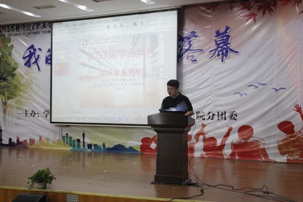 首先,国际商务学院院长致辞,回顾了2017届同学们,在校学习生活,特别是在工学结合、中东欧“16+1”峰会等重大活动中优异表现给予了肯定,同时对同学们提出了殷切期望和要求;教师代表王东生老师发言,表达了对同学的眷念之情,她告诉同学们,不管你们到了哪里,我们母校的老师永远和你们在一起;毕业生代表李国宝的发言充满激情,深深表达对学院领导、教师们敬意、谢意。