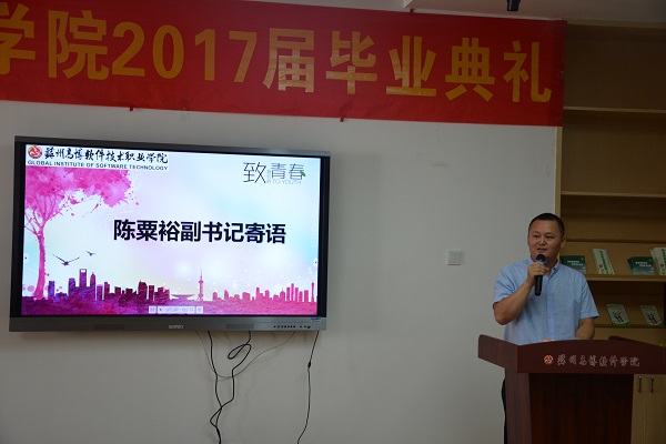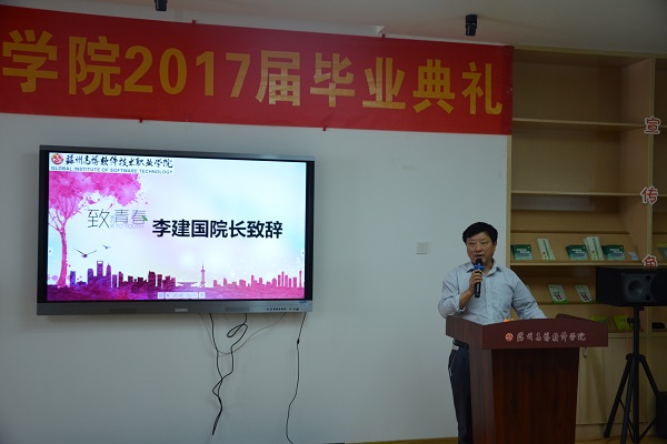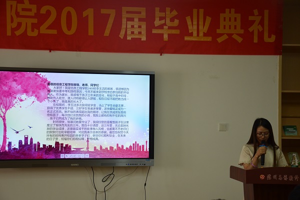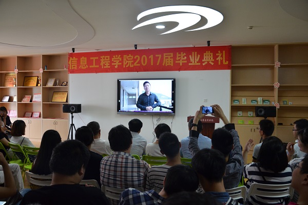 典礼在五分钟的影片《青春啊》中拉开序幕,在这五分钟里,在场的观众通过相片集回忆了从军训到毕业整个过往三年间生活的点点滴滴。会场很安静,却回荡着一种感人的氛围。影片播放完毕后,毕业典礼正式开始。李建国副院长首先致辞,他讲到“海阔凭鱼跃,天高任鸟飞”,表达了对毕业生们的谆谆教诲和殷切祝福。陈粟裕副书记为同学们送上毕业寄语,他希望同学们要学会感恩、学会沉淀、学会包容和学会取舍,勉励同学们做一个优秀的普通人。本次典礼,策划人员还特意为每一个毕业生发放一个铭刻有“信工是你们永远的欢乐颂”心手环,它象征着友谊地久天长,同学们纷纷为自己最好的朋友亲手带上这爱心之环,现场气氛很活跃,小小的手环带来的是满满的感动。
