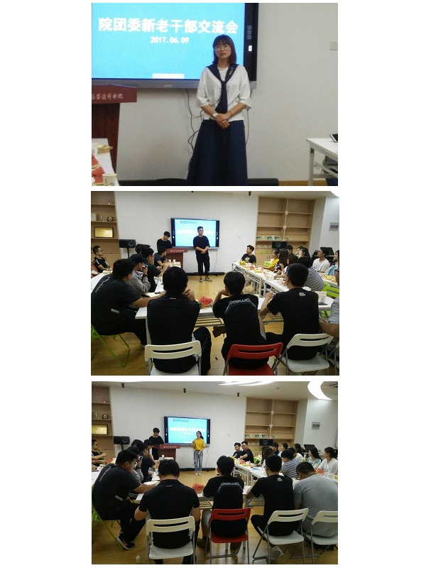 6月9日下午17:30,我院团委于青春健康俱乐部开展一年一度的新老干部交流会。出席本次会议的有我院的胡赛老师、袁晖老师各年级学生干部代表。此次会议由现任团委学生副书记方心主持。