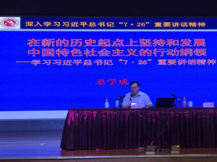 8月15日上午,江苏省委党校常务副校长桑学成教授在全省思想政治理论课专业教师培训班苏州大学培训点作了题为《在新的历史起点上坚持和发展中国特色社会主义的行动纲领――学习习近平总书记“7.26”重要讲话精神》的主题报告。苏州大学党委书记江涌听取报告,报告会由苏州大学马克思主义学院院长田芝健教授主持。桑校长首先强调要充分认识习近平总书记“7.26”重要讲话的重大意义。桑校长认为要从坚持和发展中国特色社会主义的战略高度来认识讲话的意义,要从承前启后、继往开来的高度认识讲话的重要意义,要从当前统一思想的高度认识讲话精神的意义。