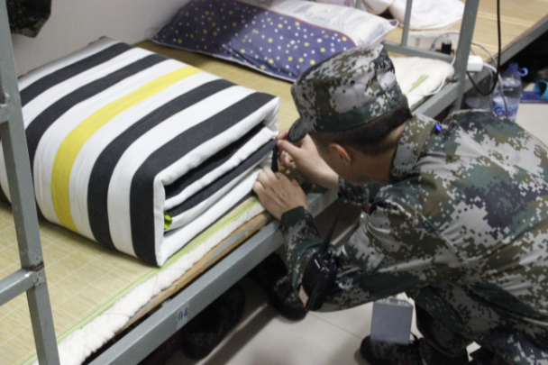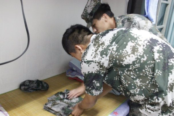 傍晚天气阴雨交加,各宿舍内务整理工作也在紧张有序的进行。为引导新生养成良好的个人生活习惯,营造整洁舒适的宿舍环境,教官对学生提出了严格的要求,向学生们演示了军人的内务标准,详细讲解并示范了叠被子、摆放洗漱用具、椅子、行李等摆放位置和方法。为整齐划一,辅导员们也对内务整理提出了严格的要求,所有墙面粘贴的小饰品全部清理,宿舍内死角平面都彻底擦洗干净,对宿舍地面也用清洁剂打扫得干净整洁。辅导员坚持每天检查一次内务,对各个宿舍高标准,严要求。经过师生的共同努力,每个宿舍都窗明几净,焕然一新。
