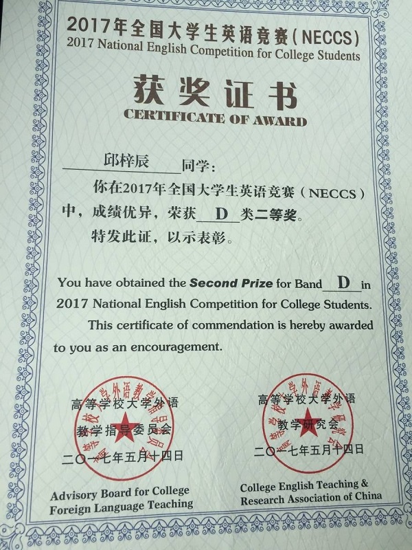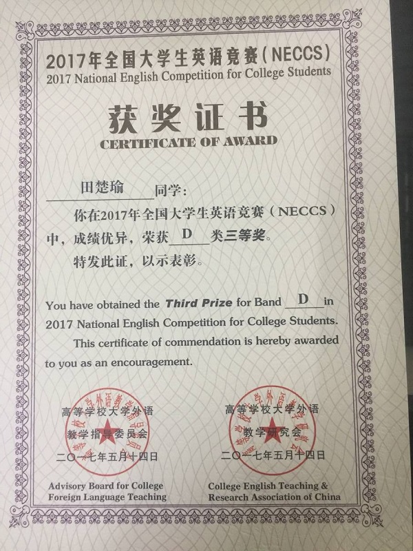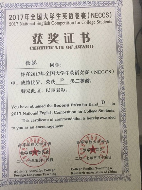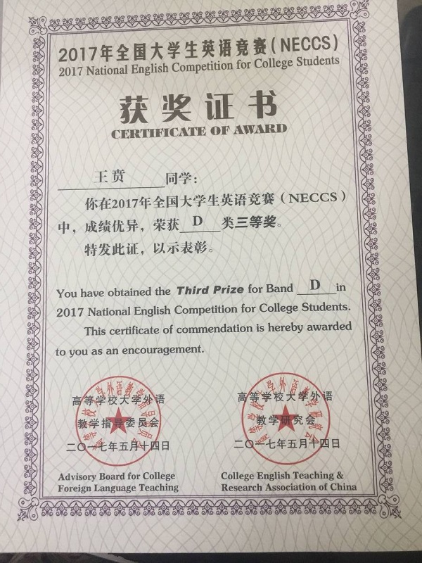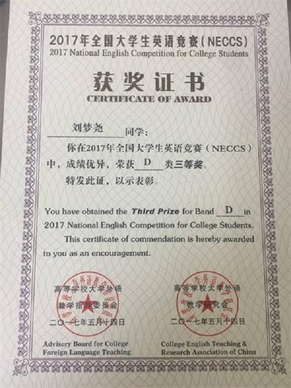 国际商务学院公共英语教研室积极响应学校“以赛促教,以赛促学”的号召,在教务部门的协助下,第一次组织学生参加全国大学生英语竞赛即取得佳绩。本次竞赛,公共英语教研室共组织80余名同学参加培训、参赛,经过紧张的角逐,2名同学获得二等奖,4名同学获得三等奖。