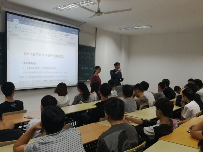为确保我院2018届毕业生相关教学工作的顺利进行,圆满完成各专业教学计划规定的全部教学内容,软件工程学院与9月21日晚6:30分在541教室开展了2015级全体毕业生的动员大会。王彤院长,吴建平副院长,施泽群书记参与了大会。大会分别对毕业班同学要做的校内综合实训、毕业顶岗实习、毕业项目工作、毕业班清欠考试等四个部分对学生做了详细的讲解,让同学们能更好的安排自己的学习和工作!