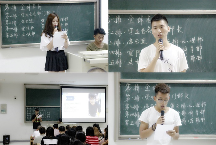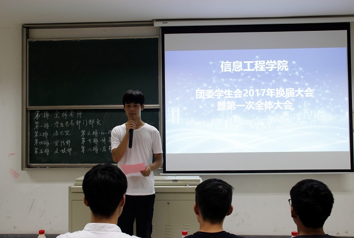 岁月如梭,转眼间又迎来了一年一度的学生会换届时间。9月26日晚六点,信工学院学生会在教学楼213教室隆重举行2017年学生会换届大会,参加本次大会的有信工学院党支部书记方世超老师、团委书记钱国君老师、团委副书记王苏苏老师等六位老师及信息工程学院学生会全体成员,大会由团委副书记朱鼎同学主持。