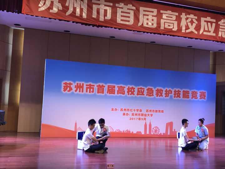 9月28日由苏州市红十字会、苏州市教育局主办的苏州市首届高校应急救护技能大赛,在苏州市职业大学举办。参加本次大赛的有苏州大学、苏州科技大学、常熟理工学院、苏州市旅游财经学院、苏州市卫生职业技术学院、苏州经贸职业技术学院等14所高校。我院作为参赛的唯一一所民办高职院校,由学生处陈�雯老师带队,校红十字会4名学生代表参加本次大赛。