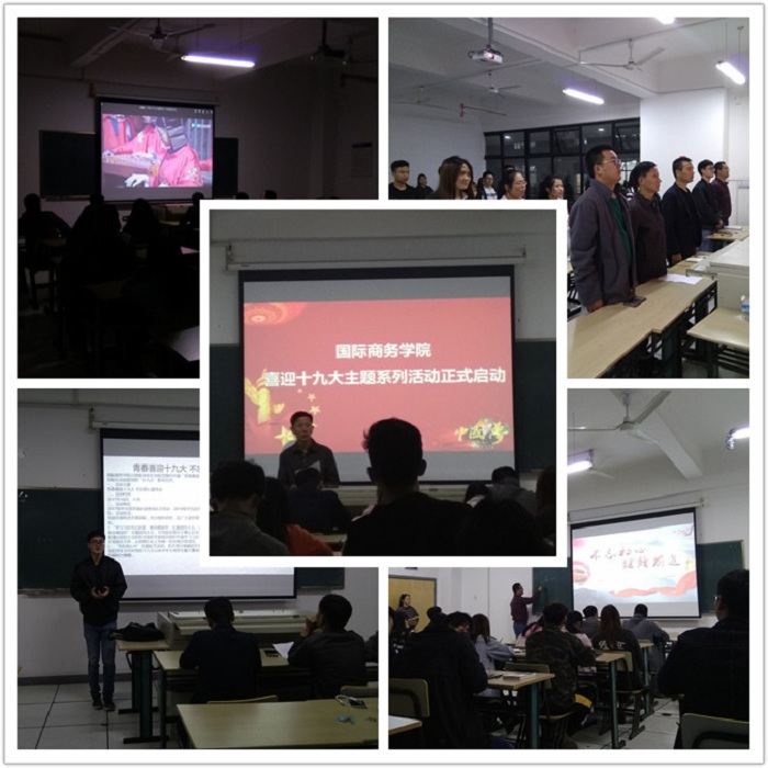 青春喜迎十九大、不忘初心跟党走。为进一步动员广大团员青年学生迎接党的十九大胜利召开,同时也积极响应团中央及校团委的号召,以自己的实际行动为党旗增光添彩,10月18日晚,国际商务学院在教学楼1-423举行了喜迎十九大主题团日活动启动仪式,参加活动的有国际商务学院学生会和各班团支部成员,党总支副书记胡启昆、学生党支部书记张红、团委书记王鑫及大一大二团总支书记张伟、顾成宜等辅导员出席了启动仪式。
