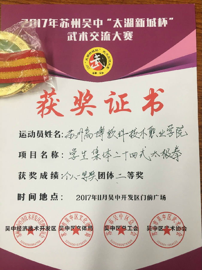 由苏州吴中经济开发区、吴中区体育局、吴中区总工会、吴中区武术协会联合主办的2017年苏州吴中“太湖新城杯”武术交流大赛,于2017年11月4日在吴中区举行。全市共有近150个武术代表队、1700多名武术爱好者参赛。
