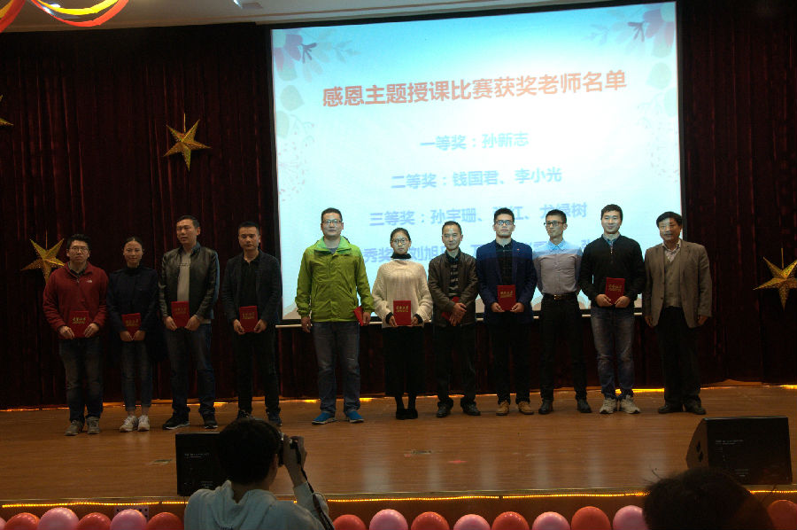 接下来,主持人宣布了“感恩”主题授课获奖老师和“感恩”征文比赛获奖同学名单。在授课比赛中,艺术学院孙新志老师获得一等奖,信息工程学院钱国君老师、艺术学院李小光老师获得二等奖,软件工程学院尤绿树老师、信息工程学院孙宇珊老师、国际商务学院张红老师获得三等奖;在感恩征文活动中,朱达、庄雨琦、周梦滢等17名同学荣获优秀征文奖。随后,李建国副院长为获奖老师颁奖,院长办公室王绍福主任、学生处邹艳星处长及各学院党总支副书记为获奖同学颁奖。