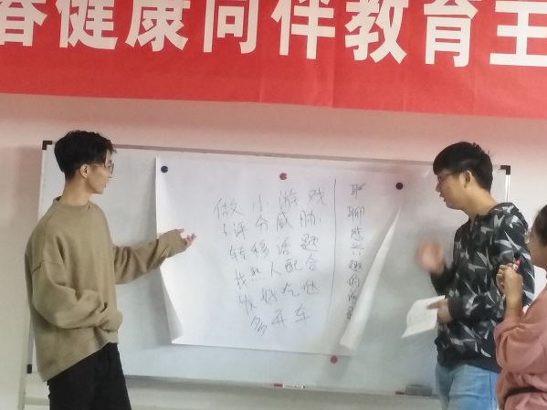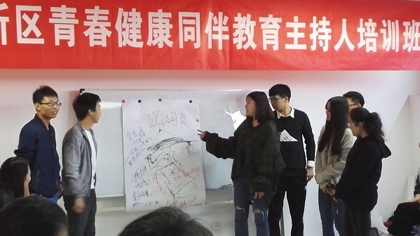 本次培训共2天,培训内容涉及同伴教育专业知识部分如团队建立与公约、同伴教育介绍、社会性别、价值观、性行为与决定、避孕与人工流产等,还涉及主持人胜任力和实践演练以及兄弟院校之间的经验交流和介绍。