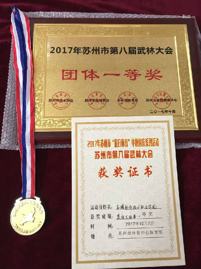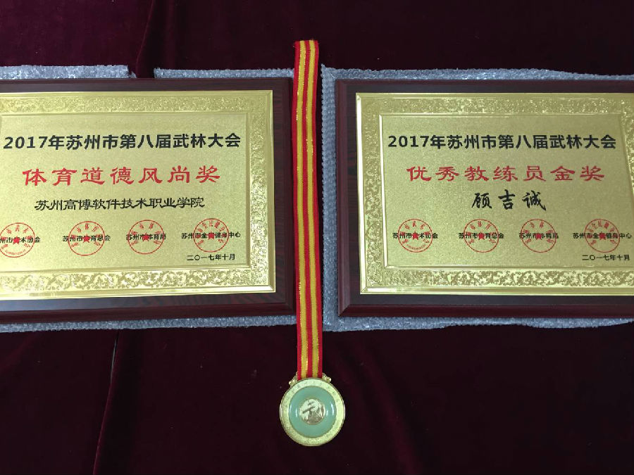 经过激烈角逐,苏州科技城高博软件学院功夫太极培训中心代表队斩获殊荣,分别荣获2017年苏州市第八届武林大会团体一等奖、2017年苏州市第八届武林大会优秀教练员金奖、2017年苏州市第八届武林大会体育道德风尚奖等奖项和荣誉称号,为学院争得荣誉,特此�贺!(供稿:基础部)