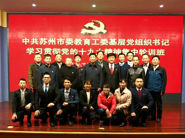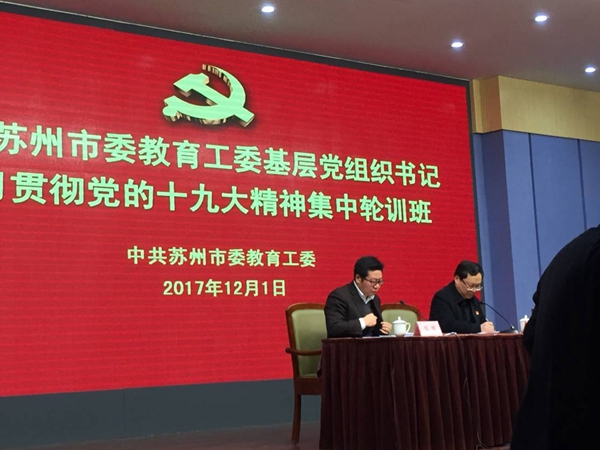 为深入学习宣传贯彻《中共中央关于认真学习宣传贯彻党的十九大精神的决定》、《中共江苏省委关于认真学习宣传贯彻党的十九大精神的通知》、《中共苏州市委教育工委关于学习宣传贯彻党的十九大精神的通知》等文件精神,12月1日,由苏州市委组织部、苏州市委教育工委组织的苏州市基层党组织书记学习贯彻党的十九大精神集中轮训、市委教育工委基层党组织书记培训班在苏州市教师发展中心四楼报告厅开班。