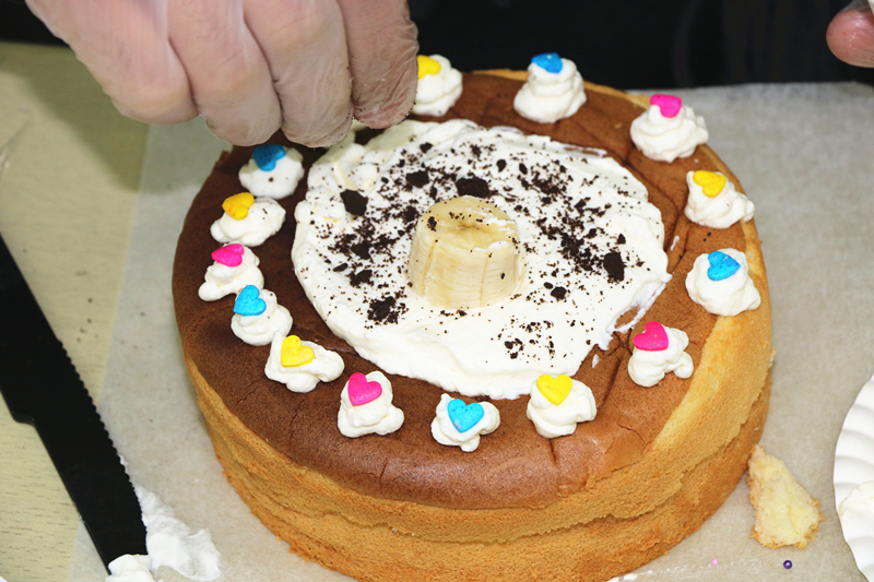 有同学将奶油涂满整个蛋糕胚,以彩色爱心为无关,奶油裱花为发辫,只错了一个萌萌的粉色少女;有同学把奥利奥碎和奶油搅拌到一起,自己调色,制作出黑色的巧克力蛋糕;还有同学将蛋糕分为上下两层,里面加入甜蜜的奶油和清新的水果……