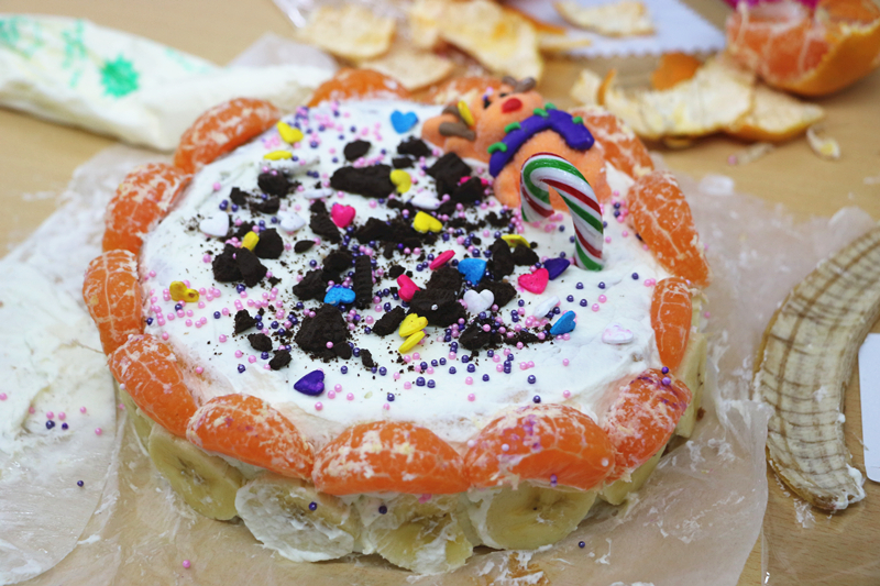 洁白甜蜜的奶油、橙黄松软的蛋糕胚、黑色的奥利奥碎、彩色的爱心、以及缤纷的水果……搭建了一个充满创意又快乐的夜晚。