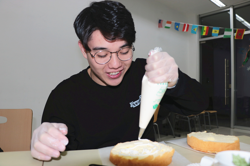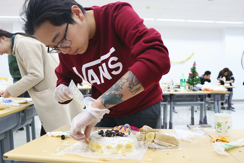 临近元旦和期末的圣诞节,早已成为年轻人相聚、放松、狂欢的时刻。因此,12月22日晚上6点,在忙碌的考试周到来之前,国际学院学生会精心策划了一场“当冬至遇上圣诞节”主题的自制蛋糕比赛,向全校师生发出了邀请。来自英国的ifp老师steve担任评委。