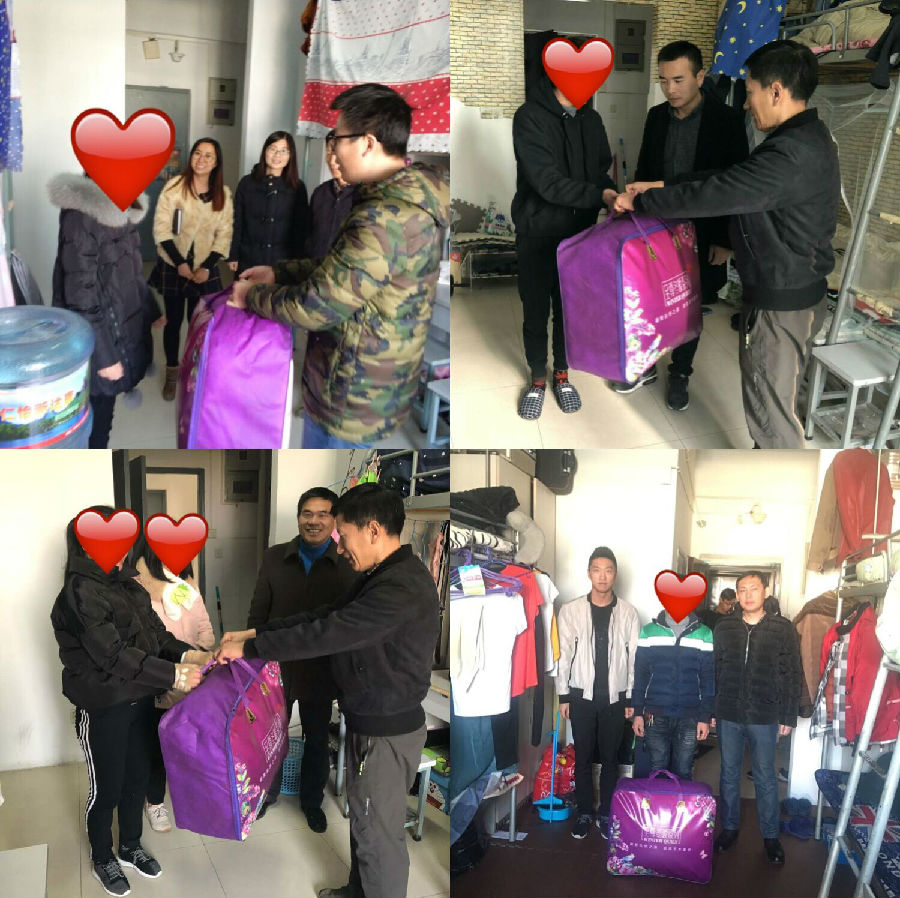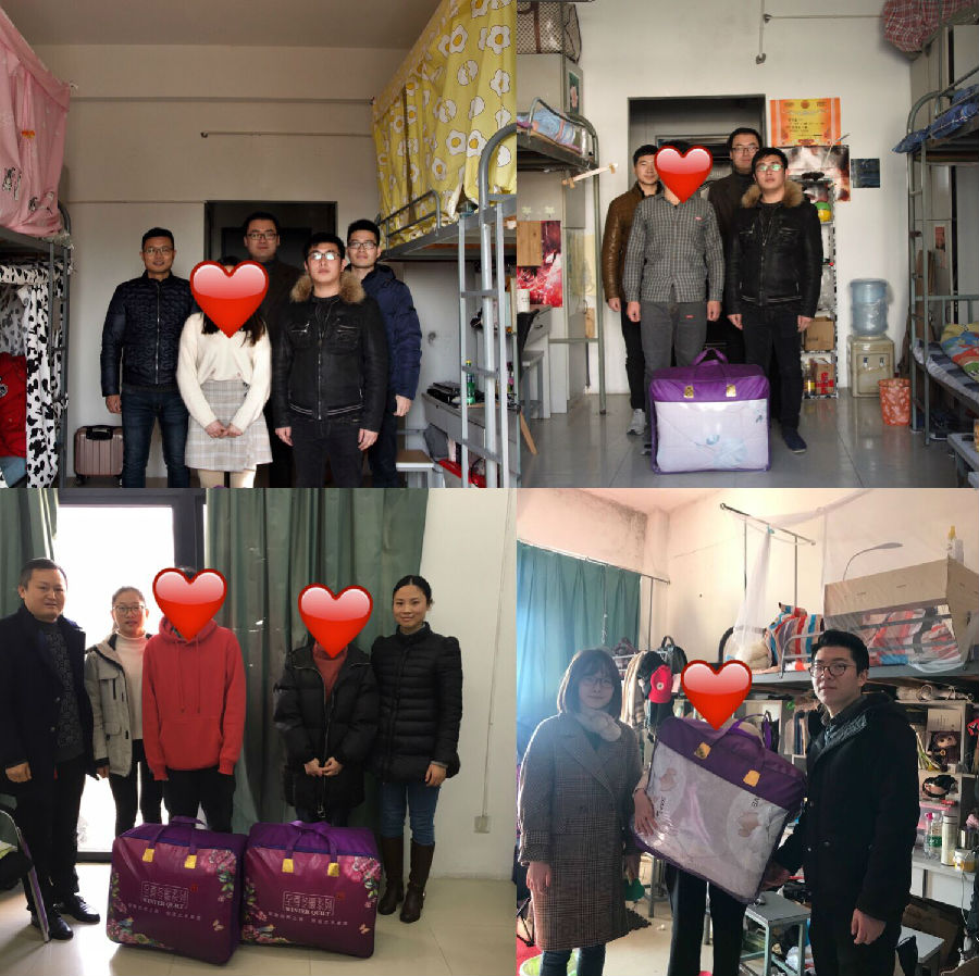 首先,通过前期的摸查,共推选出11名特困生作为本次活动的资助对象,在学生处处长邹艳星、资助中心周萍老师的带队下,各二级学院副书记、资助对接老师及相关辅导员深入学生宿舍为贫困生送棉被,各位领导都亲切的与学生进行交流,详细询问学生的生活饮食起居及日常生活中的困难,叮嘱学生注意保暖,与此同时向他们传达了一份高博师生的关心问候,让帮扶的学生感受高博的温暖。