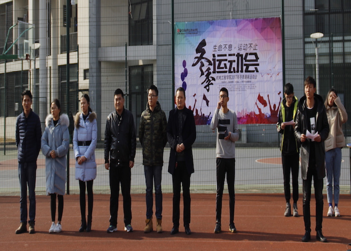 2017年12月25日中午十二点十五分,同学们整齐列队在操场上,参加此次运动会开幕式的有学生处处长邹艳星、院团委书记胡赛、机电工程学院党支部副书记陈粟裕及各位辅导员老师。在开幕式上裁判员代表和运动员代表分别进行了发言,随后学生处处长邹艳星和陈粟裕书记对本次运动会提出了要求和希望,在场的同学们都备受鼓舞。