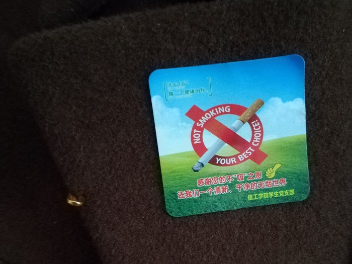 机电工程学院学生党支部制作的禁烟宣传胸贴