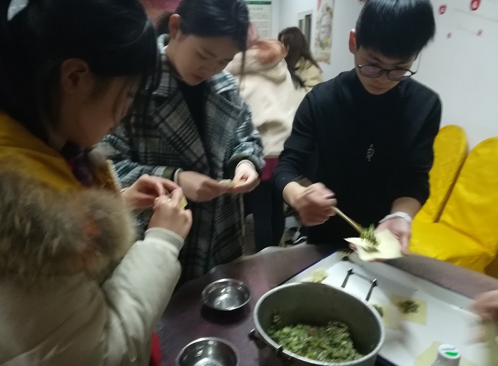 节目结束后,同学们围着圆桌为老人们包起了饺子。虽然大家包饺子的水平一般但热情很高也很认真,尤其看到老人们把热腾腾的饺子吃个精光,同学们都非常开心和满足,整个餐厅情愫流动、笑声满屋。
