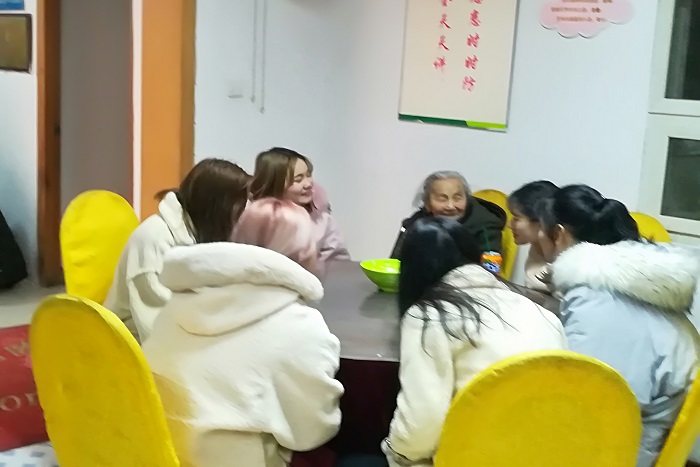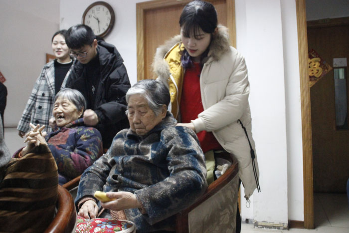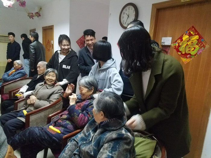 慈敬阁敬老院胡院长对志愿者们(主要是2018年计划发展入党的同学和22期入党积极分子)不辞劳苦冒雨前来看望老人给予高度赞扬并由衷感谢。随后,胡院长给大家介绍了敬老院里老人的情况。团委书记方世超老师带着同学们逐层看望了敬老院里的老人,平日里清静的敬老院一下子热闹起来,一片欢声笑语、暖意融融。很多老人走出房间和学生聊天,其中一位年逾百岁的奶奶看到小姑娘们稚嫩热情的脸很是激动,放佛是看到了年轻时的自己,拉着聊了半个多小时,讲了许多她那个年代的故事,并嘱咐同学们一定要常回来看看。