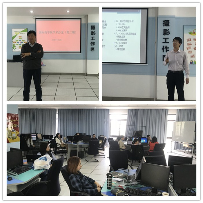 报告由我院王则斌院长主持,王院长针对我院目前在科研方面存在的问题,阐明此次学术报告的重要性。车博士从结构方程模型简介、假设检验、常用模型检验、共同方法偏误CMB、SEM方法应用等在论文发表中的运用,重点提到了理论基础和理论贡献及使用方法。