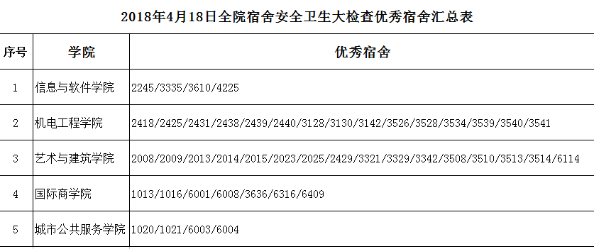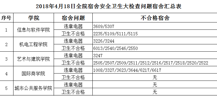 在这次宿舍安全及卫生大检查中,全院宿舍总体情况良好,但仍有部分宿舍使用违规电器及卫生不合格,共检查出优秀宿舍46间,其中,信息与软件学院4间、机电工程学院15间、艺术与建筑学院16间、国际商学院7间和城市公共服务学院4间;不合格宿舍29间,其中,信息与软件学院6间、机电工程学院6间、艺术与建筑学院11间、国际商学院6间和城市公共服务学院0间。希望全体学生向优秀宿舍学习,存在问题的宿舍尽快整改,学生处将对存在问题宿舍进行重新检查。
