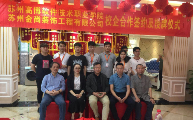 艺术与建筑学院院长、中国室内设计学会理事、江苏省室内设计学会会长、江苏省室内装饰协会常务理事徐雷教授首先介绍高博学院艺术与建筑学院办学特色优势及取得成就。结合当前装饰行业对进一步深化校企合作发表了看法,并对金尚公司前期合作取得的成果表示充分的肯定。希望未来与金尚装饰公司共同推动人才培养,创意创新,实习实训等方面更上一个台阶。总经理单士雷感谢苏州高博软件学院领导和老师给予这次合作的机会。高度肯定高博学院创新人才培养模式。目前已有32名高博学院毕业生在金尚公司工作,得到了各部门领导的认可与好评。单总也期待未来能与我院紧密合作,可以不定期的组织公司高层领导进入学校进行讲座,请贵校的学生到金尚装饰现场实践,让学生身临其境的感受当前装饰的工艺和材料。同时单总宣布成立10万元大学生创意创新基金,以大赛促学的形式鼓励高博在校学生创意创新,丰富校园文化。接着艺术与建筑学院院长徐雷和金尚单士雷总经理举行了合作签约、揭牌仪式。