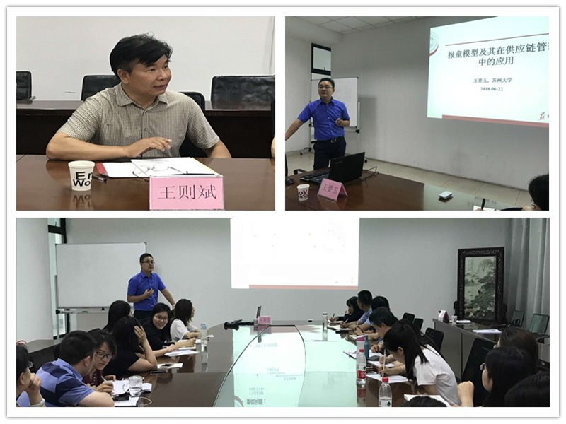 为进一步明确国际商学院发展方向,创新发展思路,拓展教师的学术视野、提升教师发展能力。2018年6月22日中午,我院全体教师在行政楼会议室举行了第四期学术沙龙讲座。王则斌院长再次邀请到苏州大学王要玉副教授,王教授以“报童模型及其在供应链管理中的应用”为主题进行了专题学术讲座。
