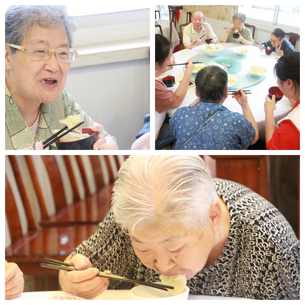 “大家来包饺子吧!”食堂大厨帮忙把饺子馅调好味道后,就进入了包饺子环节。“我包成了太阳花!”“我包的饺子站不起来!”……志愿者们的包饺子技术比不上敬老院的爷爷奶奶们,一边乐呵呵的创新,一边认真的向身边的爷爷奶奶请教。而爷爷奶奶们此时显得特别灵活和精神,放馅、沾水、粘皮,所有的动作一气呵成,还不时的指导身边的志愿者,不一会就包出了一大盆饺子。随后,大家一起品尝了饺子,爷爷奶奶们都吃的特别高兴,一致称赞味道灵的不得了!