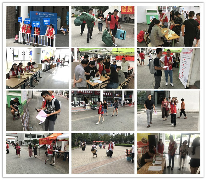 (图为志愿者耐心等待、帮助新生搬运行李、答疑解惑、添加公众号等场景)