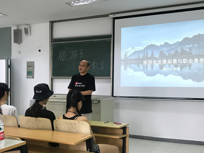 旅游管理系主任、特聘教授魏向东教授以“旅游业发展前景与学生职业素养提升”为主题,采用互动教学的方式,与学生共同探讨专业前景,将管理系三大专业与学院发展、社会需求相结合,培养学生成为与时俱进的复合型人才。新老生交流会管理系杨凡槿老师主持,郑梓铭、赵晨晨、李雨、陈月等四位同学结合自身在校经验进行分享。