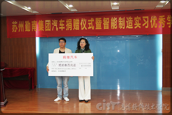 9月25日上午,学校在实训楼会议室举行勤南集团汽车捐赠仪式暨优秀实习生表彰大会。参加仪式的有高新区人力资源开发中心副主任刘军、市人社局巡视员于栋梁、高新区人社局领导龚路林、高新区技职院校研究会秘书长陆忠德、勤南集团董事长费金陵等公司领导、苏州高博软件技术职业学院副校长陈家颐、副校长张明燕、机电工程学院院长廖振强、副院长蔡伟义、资产管理处处长耿明华及校企合作办副主任马浩。仪式由马浩副主任主持。