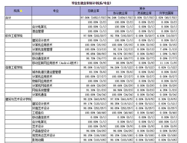 其中,软件工程学院、机电(原信息工程)学院就业率均超出95%以上。建筑与艺术设计学院就业率超过98%以上。国际商务学院的会计电算化、酒店管理等专业均为100%,创历史新高。