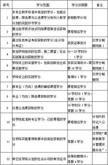 第三十五条 学院实行学分制管理,为贯彻以人为本,鼓励学生个性发展,设立学生学分银行,用于课程置换与学分置换。学分银行涉及的学分范围见表1:
