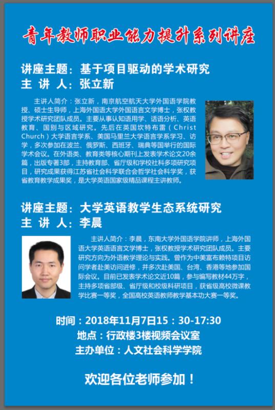 为了提升我院青年教师的教学科研水平,人文社会科学学院特邀请张权学术团队南京航空航天大学外国语学院教授,硕士生导师张立新教授,东南大学外国语学院讲师,上海外国语大学英语语言文学博士李晨老师来我院讲座,具体安排如下,欢迎各位老师参加!