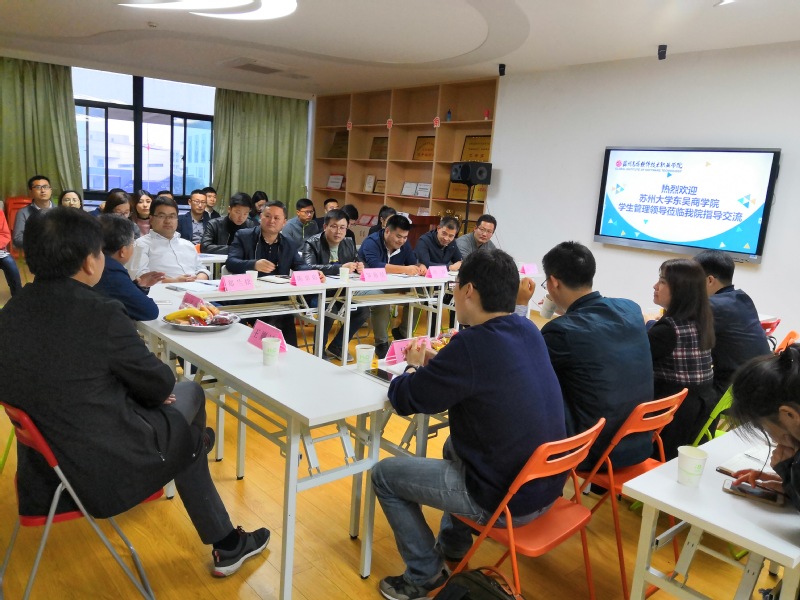 第二项是苏州大学东吴商学院学管工作经验分享交流活动,东吴商学院党委副书记、副院长董娜结合自己20多年的工作经验,从“辅导员沟通技巧”、“学生社团管理”和“辅导员个人发展”三个方面进行了工作经验分享。随后我院辅导员与东吴商学院学管团队就毕业生管理、学工团队建设、学生干部培养等内容进行了交流。