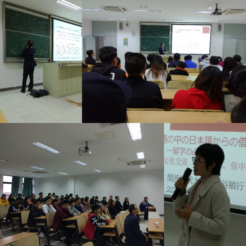 在近两个小时的讲座过程中,泽谷教授使用中文、日语双语教学并兼以大量板书,为的是能够让初学日语的大一学生听懂讲座内容。泽谷教授借助大量日语词汇PPT与板书,详细解读了中文、英语、法语词汇中借用的日语词汇,讲座进一步加强了中、日文化交流与中日高校学术交流。