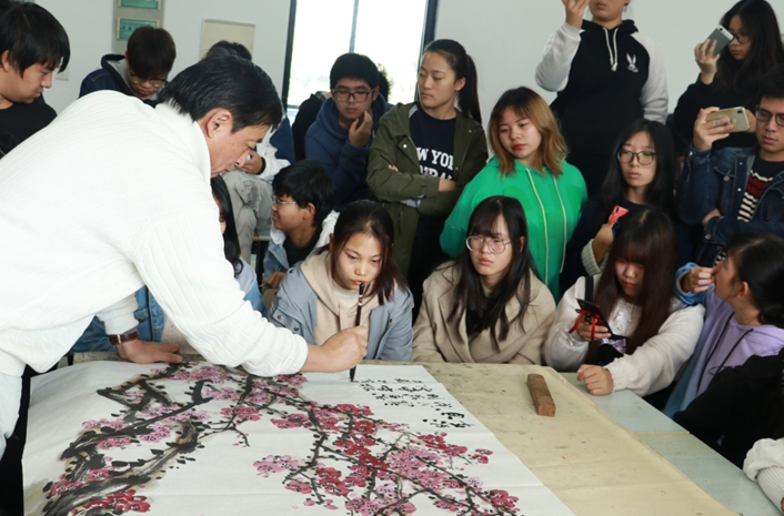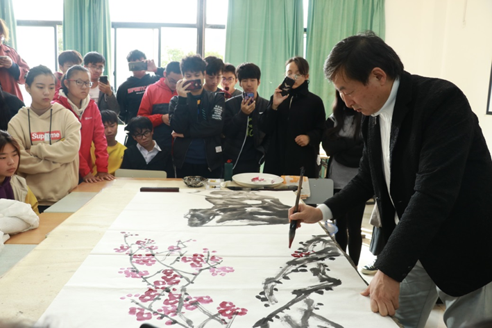 廖军教授从普及国画基础知识开始,让同学们了解我国传统绘画的特点与魅力,并向同学们传授自己多年来绘画创作的经验。开始绘制之后,廖军教授指出国画创作要做到心中有画、落墨无悔。从布局一块墨色的太湖石开始到勾花枝、点花托、画梅花、画鸟儿等步骤的逐渐完成,一方太湖石、一树梅花、两只鸟儿在廖军教授的大胆落墨和小心收拾中逐渐清晰,一幅晴窗之下的《春消息》栩栩如生的展现在大家面前。